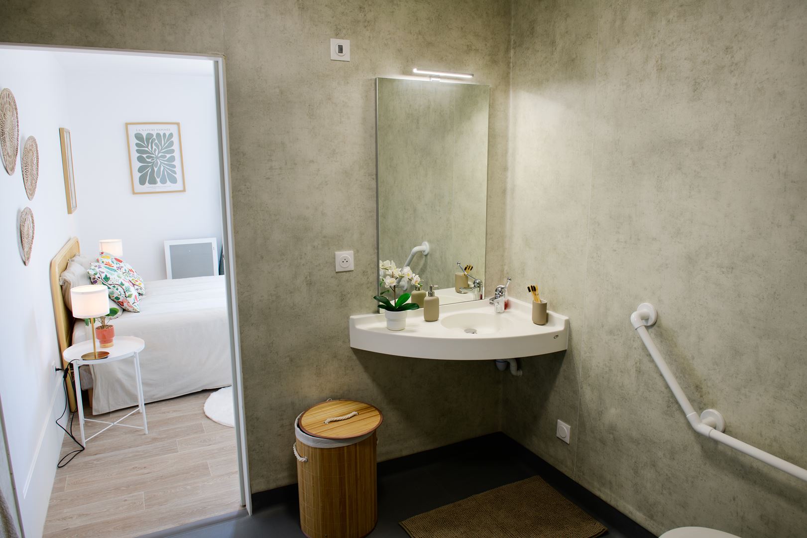 Douche à l’italienne sans seuil, toilettes rehaussées, barres de maintien